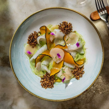Lâminas delicadas de peixe fresco, manga madura e pepino crocante, servidas sobre um cremoso de ervas e finalizadas com grãos crocantes e flores comestíveis. Um prato leve, refrescante e cheio de elegância tropical.