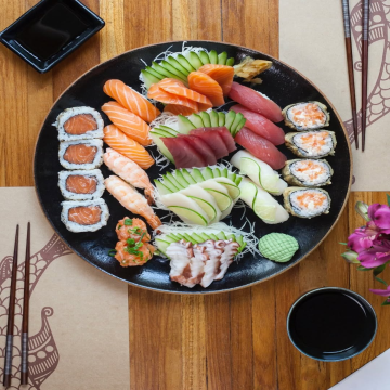 12 Sushi (4 salmão, 4 atum, 2 salmão skin e 2 shiko de salmão), 16 sashimi (8 atum semi grelhado e 8 salmão semi grelhado), 14 makimonos (8 hot Filadélfia e 6 salmão skin)